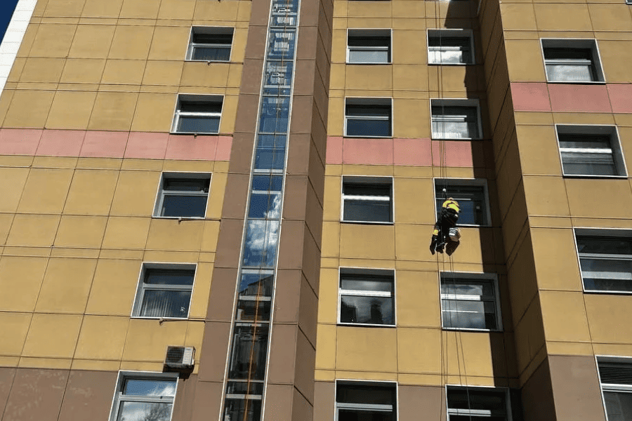 Наша команда — это обученные промышленные альпинисты с большим опытом работы. Мы соблюдаем все требования техники безопасности и используем профессиональное оборудование, благодаря чему обеспечиваем качественное внешнее мытье фасадов без повреждений.